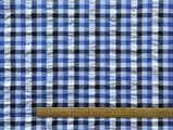 白×水色×青×紺のチェック柄が爽やかな、播州織のコットン100%サッカー生地を使った、ヘチマカラーのTブラウスです。