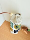 入れ口は巾着タイプで、ワックスコードの紐をつけています。ストッパーをつけていますので、しっかり絞れます。