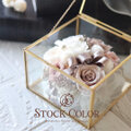 ゴールドメタリックの縁どりがとってもおしゃれなガラスケースに、ローズ、紫陽花など厳選したプリザーブドフラワーをたっぷり入れたフラワーボックス♪