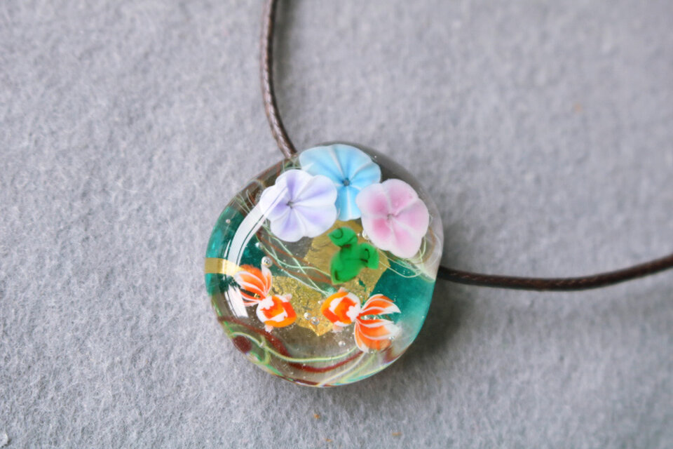 金箔を貼り付けた水色の地に、朝顔を咲かせ金魚を泳がせました。