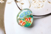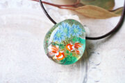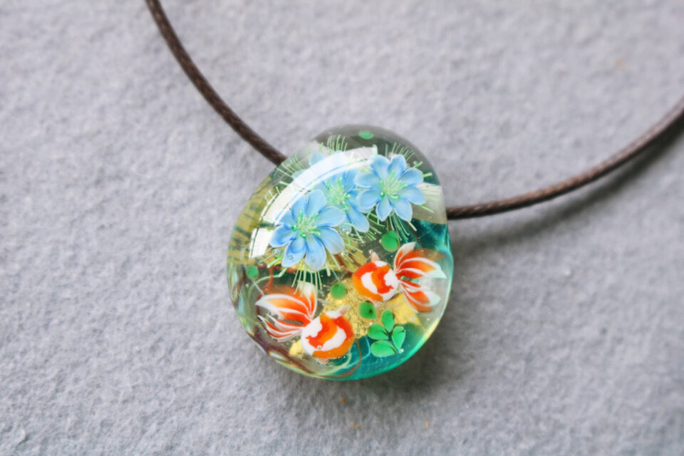 金箔を貼り付けた水色×透明の地に、ニゲラを咲かせ金魚を泳がせました。