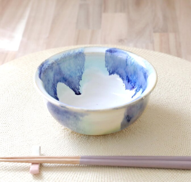 深さのある丸い鉢の形に成形し、艶やかな白い釉薬をかけ、数種類の青と緑の釉薬で模様を施しました。