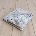 質感のあるベージュグレー地に色とりどりのデイジーが描かれています。