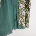少し黄みを帯びた深いグリーンに、白とライラック色の花が咲くコットン。