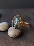 黒や青の入った深緑のカイヤナイトを使ったリングです。