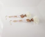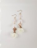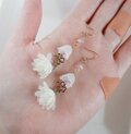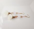 人差し指ぐらいの少しだけ小さめサイズのふんわり可愛らしいホワイト色のフラワータッセルに四葉のクローバーのパーツとすりガラス風のすずらんビーズを合わせたお洒落なピアスとなっております☺