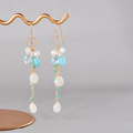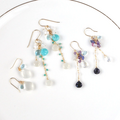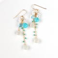 艶やかなホワイトムーンストーン、涼やかなブルートパーズ、きらりと輝くロイヤルブルームーンストーンと淡水パールを添えた、夏のドラマティックなロングピアス。