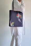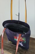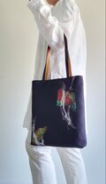 シャンタン風の黒の生地にビビッドな柄のプリントが施された、シンプルなトートバックです。