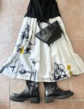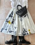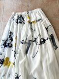 オフホワイトの生地に、紺や黄色でお絵描きしたようなアートな雰囲気。お出かけが楽しくなる、気分を上げてくれるスカートです。