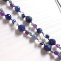 使用パーツ:フローライト ソーダライト ブルークォーツ ラピスラズリ アメジスト 水晶 グリーンアベンチュリン メタルビーズ(シルバー色) ワックスコード(ヒヤシンス)