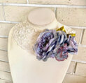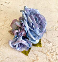 少し光沢のあるシールの布をブルーグレイに染めて作ったクラシックカラーでまとめた大きなローズのコサージュです。
