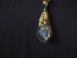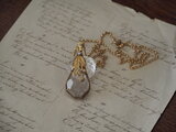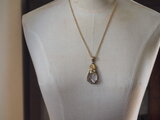 とっておきの美しい水晶は、表側にはシャープなカットが入っていて、裏側は原石のままという変わったものです。今回の水晶には裏側の原石の模様が反映されて非常に美しいきらめきとなって現れています。大粒なので、少し長めのチェーンをつけましたが、ご希望によって変更ができますので、お知らせください。