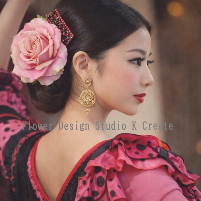 大輪のピンクの薔薇のヘアクリップ フラメンコ ダンス 髪飾り ピンク 薔薇 バラ 髪飾り