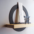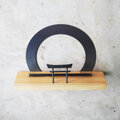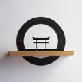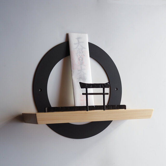 鉄のリングと鳥居、そして岡山県のヒノキ材を組み合わせた、壁付け(三社)タイプの神棚です。