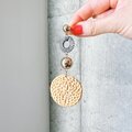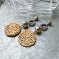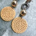ラタン、ゴールドボール、ストライプフープがぶら下がったピアス。