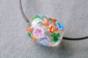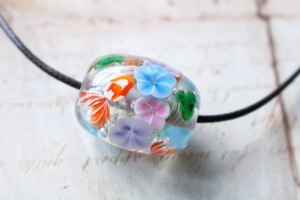 泡を入れた透明の地に、朝顔を咲かせ金魚を泳がせました。