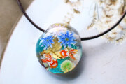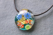 金箔を貼り付けた水色の地に、睡蓮を咲かせ金魚を泳がせました。