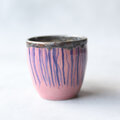 黒土にピンクの化粧泥を刷毛塗りした地に、藍色の呉須で縦線の模様を手描きしたモダンアート柄のマグカップです。