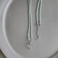 つや消し加工された優しい色合いのアマゾナイトと、つるんとした表面に内包物を含んだ水晶や原石のままの水晶、カレンシルバービーズなどを合わせたネックレスです。