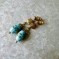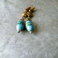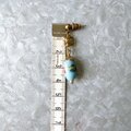 フラワーが描かれたライトブルービーズがぶら下がるゴールドトーンピアス。
