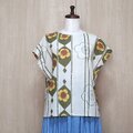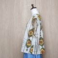 フレンチスリーブ、ボートネックで後ろループにワンボタンです。締めつけ感が無く風が通って涼しいです。