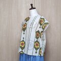 明るい色柄ですが銘仙の日本ならではの色合いは華やかさの中にも上品な感じがします 日本人の肌色にしっくりと馴染みます 前明きボタンなので閉じて1枚で着ても 中にTシャツを着て上から羽織って前明きで着ても素敵です メンズのMサイズですが 普通サイズの女性の方から大柄の方まで着こなせると思いました 秋色のブラウスも秋の花がプリントされていて 程よい透け感がお洒落でした これからの季節に嬉しい作品です