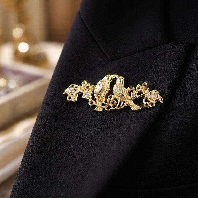 寄り添う2羽のラブバードをモチーフにした、愛らしさと上品さを兼ね備えた真鍮製ブローチ。