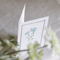 幸せを運ぶ花、青いデルフィニュームの小さなカードは、大切な方への心温まる贈り物にひっそり添えるのに最適。シンプルでありながらエレガントなデザインは、シチュエーションを選びません。