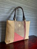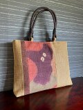 麻地の無地帯地に、絞りの帯地の端切れを剥いで手提にしました。