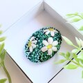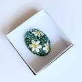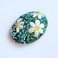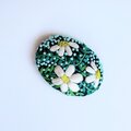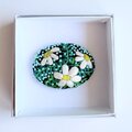 サーモンピンクの地に黒い花の刺繍、ありそうでなかったこの色のとりあわせ、すてきなブローチでした。