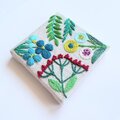 リネンに少しレトロな雰囲気の色合いで小さなお花を丁寧に手刺繍しました。