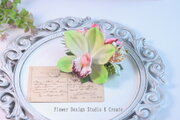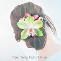 黄緑のシンビジュームとプルメリとアストロメリアのヘアクリップ フラダンス 浴衣髪飾り ウェディング リゾ婚 挙式 フラダンス