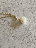 華奢なチェーンにスルーさせるペンダントトップで、凝ったチャームなどに填められたジュエリーデザインではなく、いい意味でラフな開放感のあるデザインのバロック一粒のネックレス。