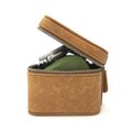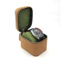 コンパクトなサイコロ型の腕時計(ウォッチ)ケースです。硬い芯材を革で包んだ、まるで革箱のような作りはとても丈夫で、大切な腕時計を保護しながら収納出来るので、家での保管にはもちろん、出張や旅行での携帯にも大活躍します。天蓋はラウンドファスナー式で全開出来るので出し入れは簡単。付属のクッションにベルトを巻き付けてケースに入れるだけです。ファスナーのエレメント(歯)が直接時計に触れる事がないように裏地で壁を作っているので、大切な時計を傷つける事はありません。