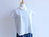 白無地のリップル生地で切り替えた小さなへちまカラーと、前たてに並べた高瀬貝の白ボタンがアクセントの、シンプルなクレリックブラウスです。