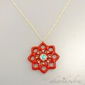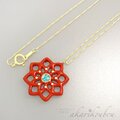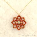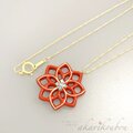 桧の木を花モチーフの透かし彫りにして朱漆を塗り重ね、鮑貝の螺鈿と純金箔の箔押し技法でラインを施した漆ペンダント。木の彫刻なのでとても軽くできています。