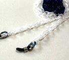 また、眼鏡とチェーンをむすぶ ゴムのパーツは 通常よりも しっかりとメガネをホールドしてくれる 抜けにくい素材のものを使用しております。。ゴムの間の金属(アメリカ製ピューター)がうごきますので、そこをあけてメガネを通し、好きな位置を決めたら、また部品で締めて、うごかないようにしますが、その際、かならずコードの部分でひっぱらないよう、下部のゴムの部分を持ってから行ってください。