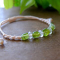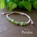8月の誕生石で「太陽の石」とも象徴される魅力的なタンブル型のペリドッドが引き立つように、明るめのコードシンプルに編み込んだマクラメブレスレットに仕上げました。
