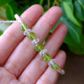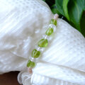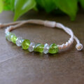 透明感があり天然のクラックはありますが内放物が少なく、新緑を思わせる爽やかなグリーンカラーが美しい良質なアメリカ産のペリドットとカット水晶を組み合わせたマクラメ編みブレスレットです。