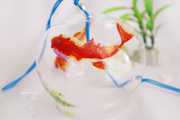 紅白の更紗模様の金魚と透明のビーズ、青い紐が爽やかな風鈴です。