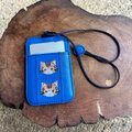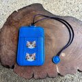 ドジャーブルーの牛革に茶トラ猫の刺繡を施しました。