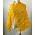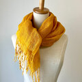 育てましたマリーゴールドの花で麻のストールを鮮やかなオレンジがかったイエローにお染めしました。