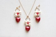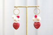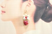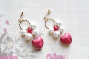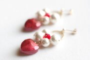 リングパーツに木の実のように大小のコットンパールを連ね、レジンの光沢のあるハートパーツを吊るしました。