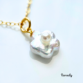 フラワー型の淡水パールに、上品な艶めきを放つフラットなホワイト淡水パール(6月の誕生石)をあしらったペンダントです。