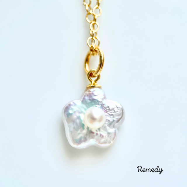 可憐でありながらどこか凛とした佇まいを持つこのペンダントは、淡水パールならではの優しい光沢と、お花モチーフの愛らしさが絶妙に調和した作品です。