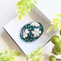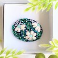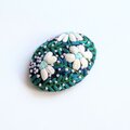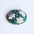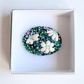 サーモンピンクの地に黒い花の刺繍、ありそうでなかったこの色のとりあわせ、すてきなブローチでした。