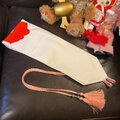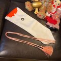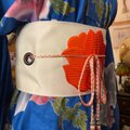 大輪の朱色刺繍と珊瑚色の帯紐タッセルで