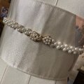 艶やかな銀砂色の名古屋帯を、前帯とお太鼓の二部に仕立て直した二部式帯です。しっとりとした地に上品な煌めきを宿す銀糸が織り込まれ、淡桃の扇には牡丹や菊がふわりと重ね描かれて、アクセントの朱花がぱっと華やぎを添えます。波のようにうねる花唐草のラインが全体を優雅にまとめ上げ、結ぶだけで後ろ姿に凛とした格式を演出。合わせたパールの飾り紐を通せば、アンティークのような優美さと今っぽい抜け感が同時に叶います。