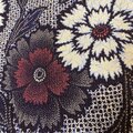 深い藍紺の地にリップル絞り特有の極細ドットがびっしりと浮かび上がり、その陰影の上を、生成りがかった白と淡い水色で縁取られた大輪の花柄がリズミカルに咲き誇ります。花芯にはくすみボルドーからワインレッドへと滲むグラデーションがさりげなく差し込まれ、涼やかなネイビーと落ち着いた赤桃系トーンが絶妙に調和。蔦や小花のモチーフも同系色で絡み合い、波のようなドットの揺らぎと重なって奥行きのある華やかさを演出しています。