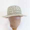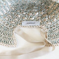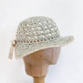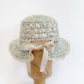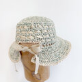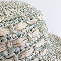 ユーカリの様に爽やかな色の帽子です。夏の暑い日々、後部で髪を結びたい時にも被れるように作りました。麻糸で編み込み模様を施し、一部に隙間を作ることで涼しくお被りいただけます。後部のグログランリボンでサイズ調節もできます。